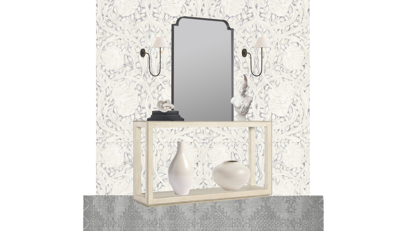 A timeless balance of classic detailing and modern restraint, this Transitional foyer layers sculptural forms with refined neutrals. Clean lines and soft textures let the architectural wallpaper shine while thoughtful accents add quiet sophistication. It’s an entryway that feels collected, elegant, and endlessly versatile.